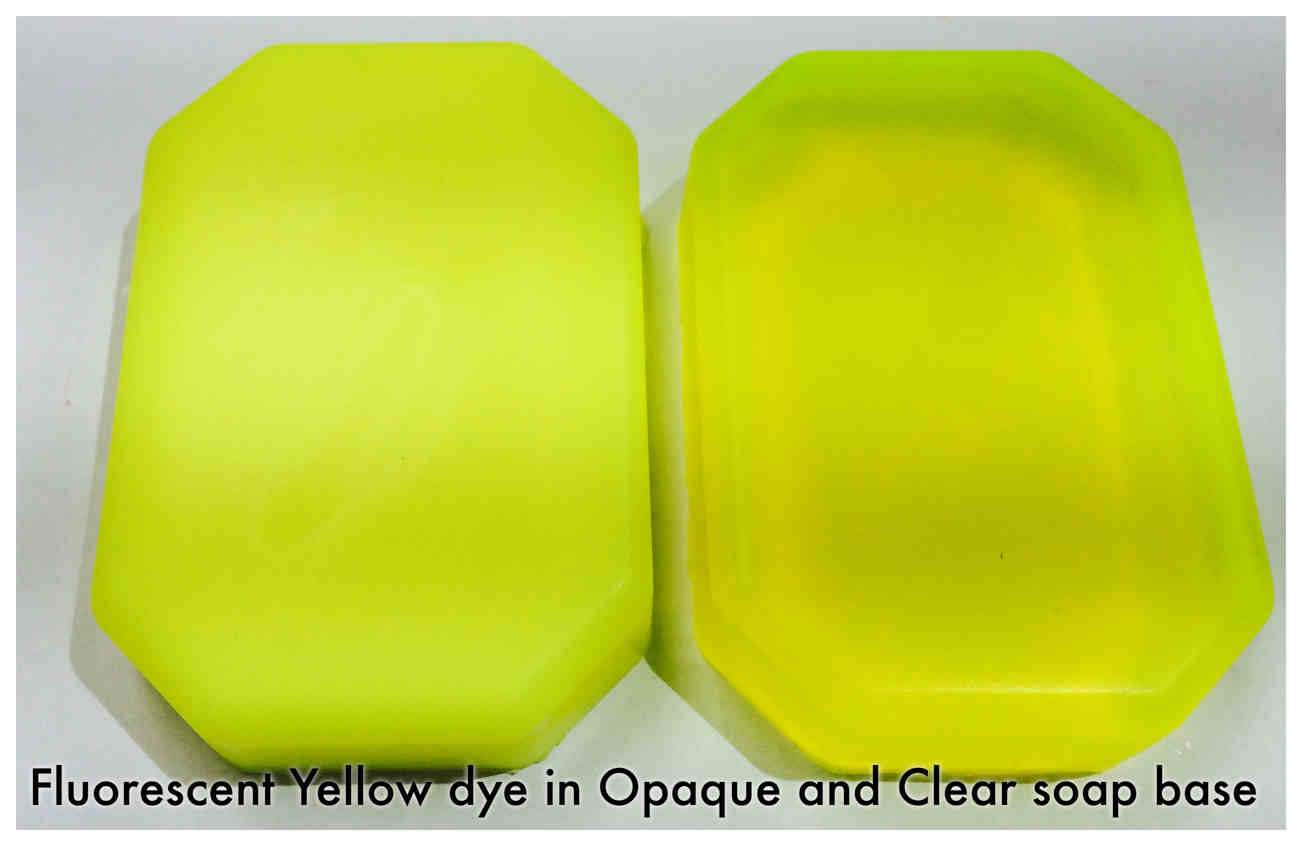 In clear soap it looks fluorescent but not quite glow in the dark. In opaque bases, it is extremely bright and gives a good solid colour.
